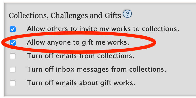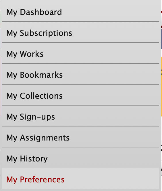 There's only two simple steps to signing up: make an AO3 account and fill out our sign-up form.In the form you will list all the preferences of what you want as a gift and what you want to make as a gift so we can try to pair you up with prompts that you vibe with. There is also a NSFW option for giving/receiving gifts if you are 18+ and opt in for that.Also, make sure your AO3 account has enabled gifting (if you have a new account no worries this is the default setting)You can do this by hovering over your username on the dashboard and going to "my preferences"
